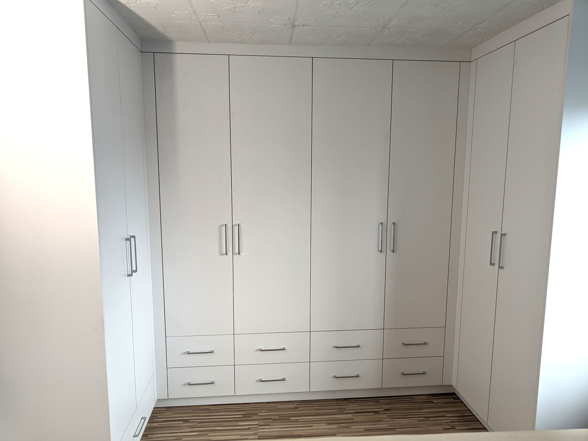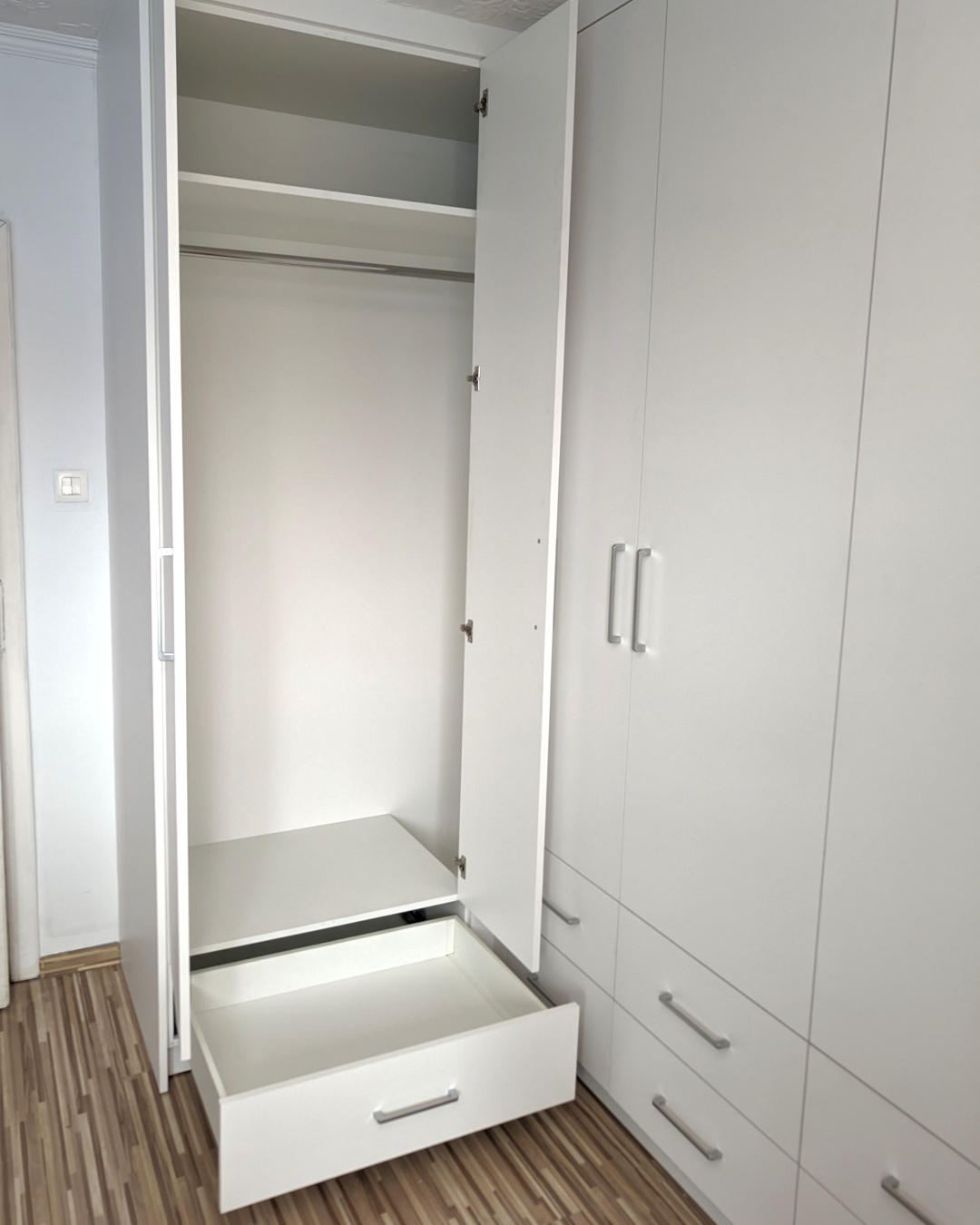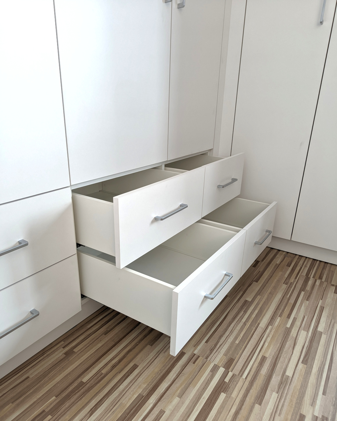 Projekt, produkcja i montaż dużej zabudowy-garderoby w kształcie litery U. Meble zostały wyposażone w zawiasy BLUM oraz 9 szuflad GTV Axis Pro.