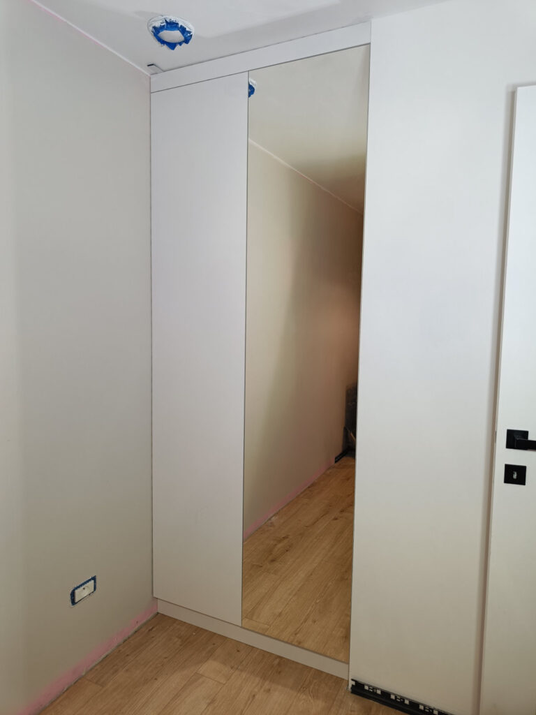 Szafa wnękowa wykonana z białej płyty laminowanej Kronospan 8100 SM. Cokół, blenda oraz front szafy wykonane zostały z płyty akrylowej w białym połysku. Drzwi otwierane na tip-on.